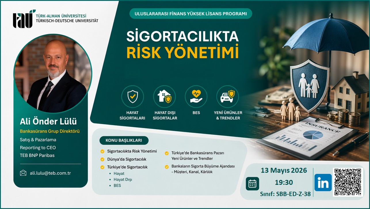 Derste, Dünyada ve Türkiye’de sigortacılığın mevcut durumu, bankasürans pazarı, risk yönetimi stratejileri ve sektördeki yeni trendler ele alınacaktır. Sektördeki profesyonel işleyişi ve gelecek öngörülerini birinci ağızdan dinlemek isteyen tüm öğrencilerimiz ve ilgililer davetlidir.